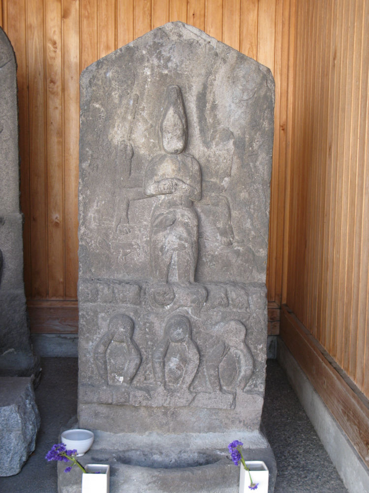 とくに真ん中に置かれている、一番古い寛文9年の庚申塔ですが、青面金剛は普通は焔髪とか怒髪といわれる逆立った髪型をしていますが、この庚申塔の青面金剛は丸坊主です。