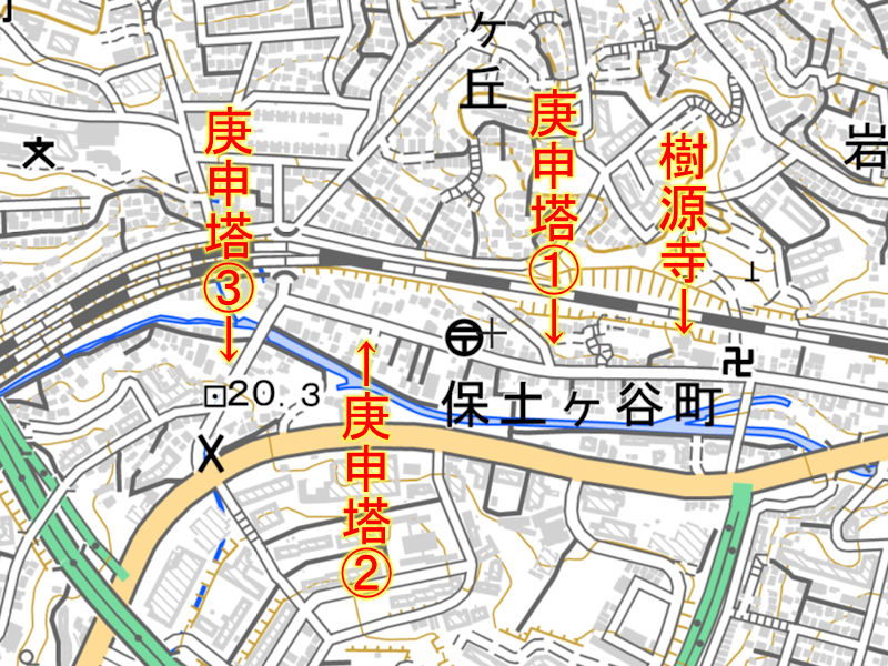 保土ケ谷宿の西側、上方見附を出てから権太坂の入口にかけても庚申塔があったことが、江戸時代に作られた絵図に載っています。