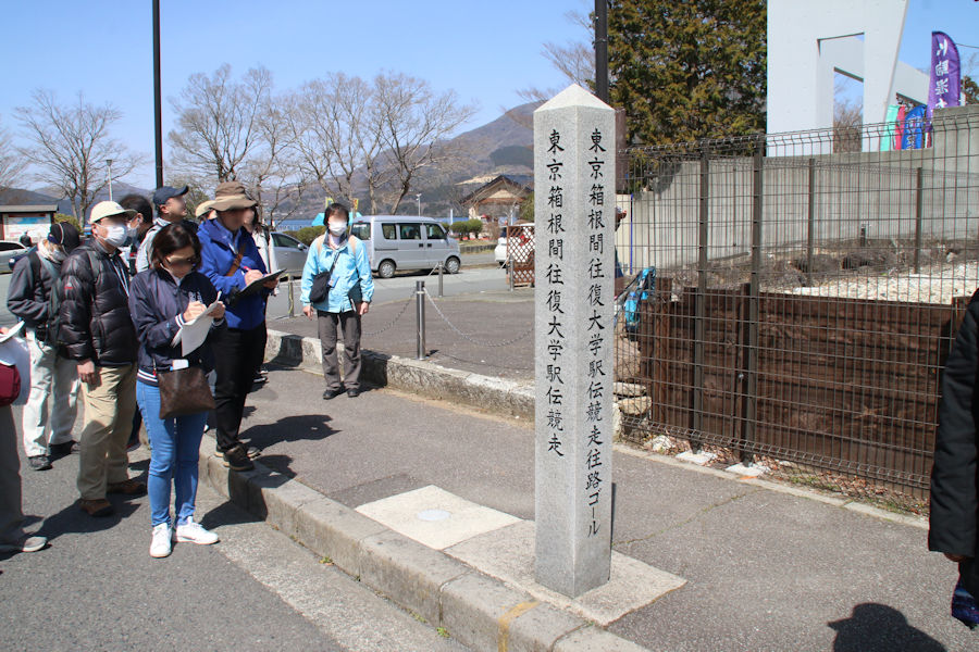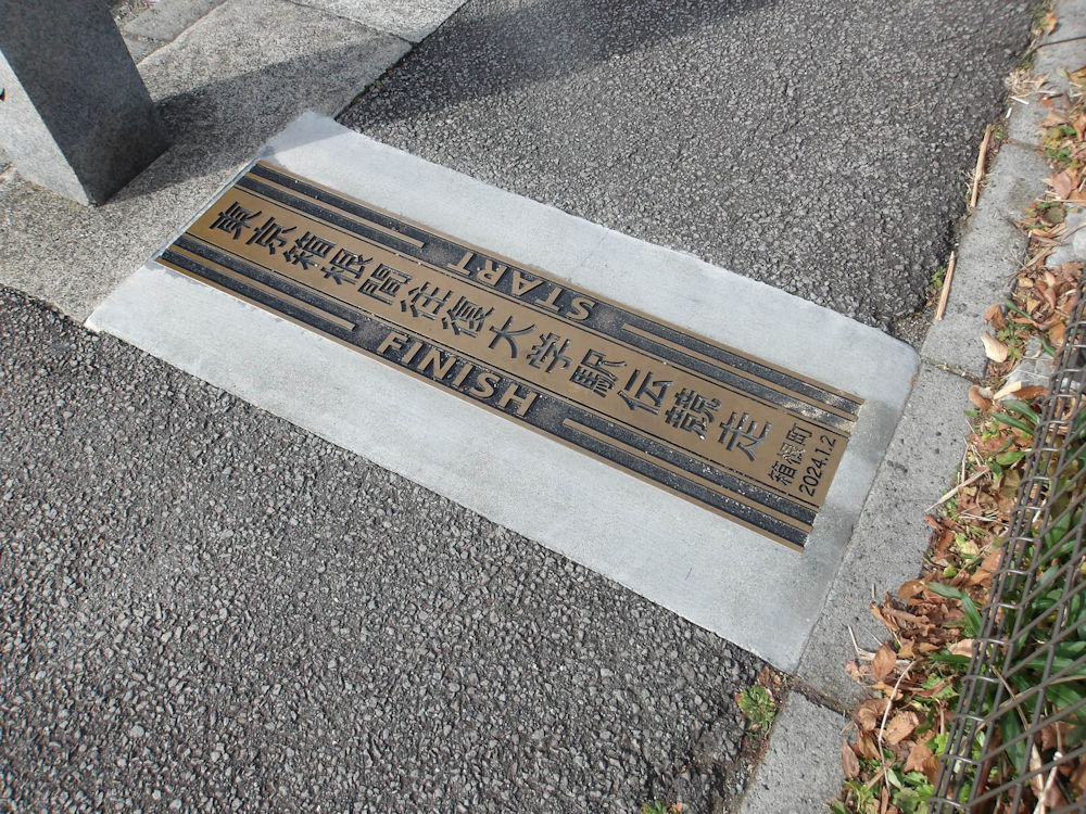 私も何度も映像を見直したのですが、往路ゴール地点は人がいっぱいいすぎて、この碑がどこにも写っていないのです。