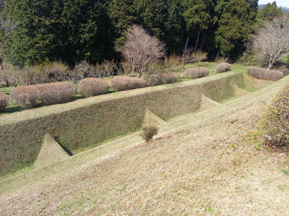 戦国時代当時に造られたほとんどの城の防御施設は、空堀と土塁とで成り立っていますが、山中城にも多くの空堀と土塁が現存しています。
