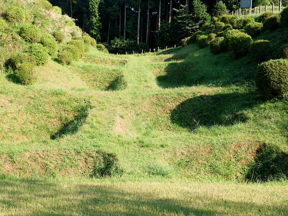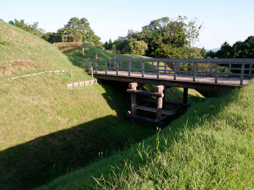空堀については発掘調査とその後の作業によって、堀の中を仕切るように設けられていた土盛りが復元されています。