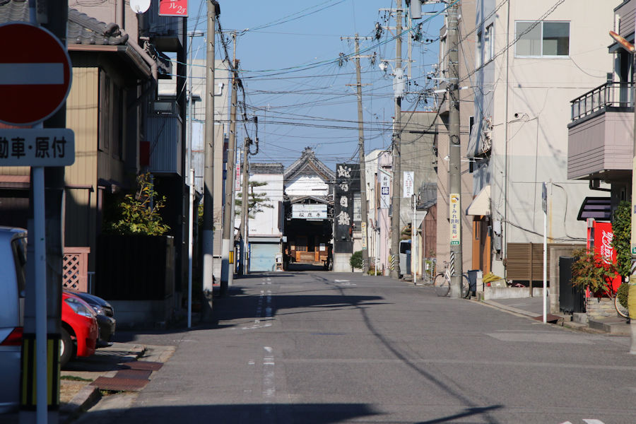 この曲がりくねった道の中でも北の方の材木町のあたり、ファミリーマートの角から伊賀川にかかる柿田川に行く途中で、道の奥の方にお寺が見えるところがあります。
