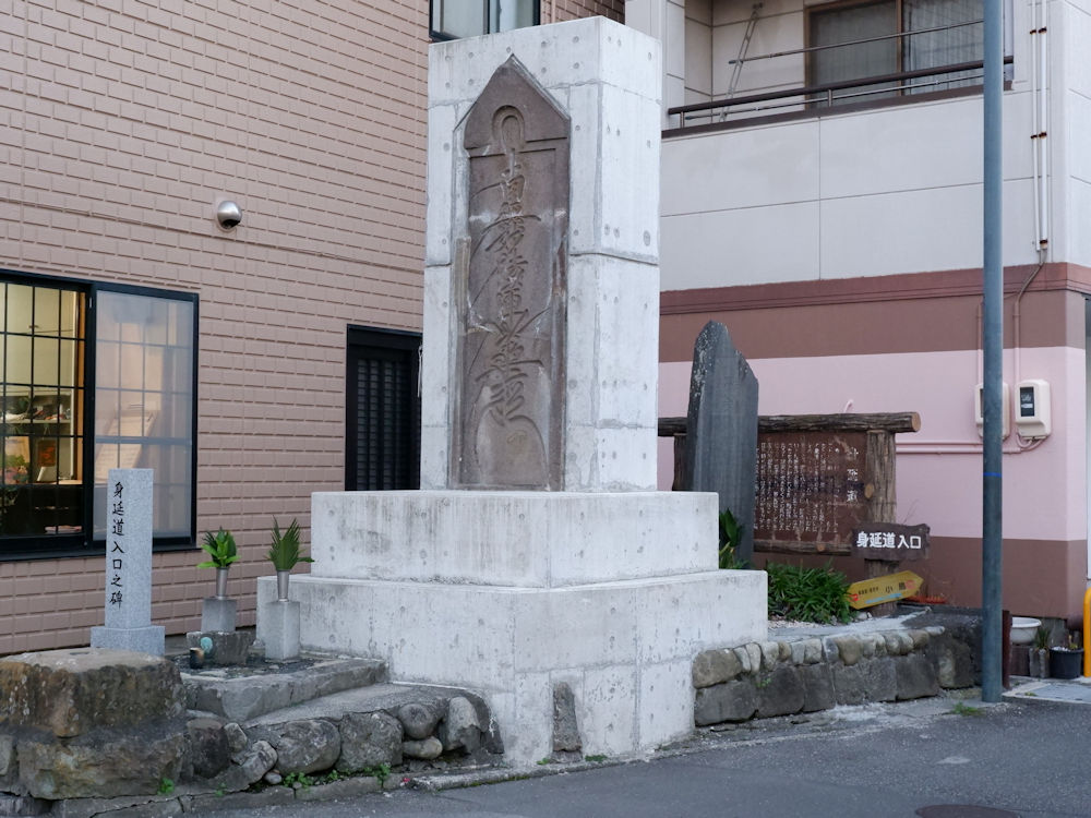 陣屋の場所は東海道の興津宿の北、この題目碑のある交差点から始まる身延道を、およそ4.5キロ興津川沿いに北上したところです。