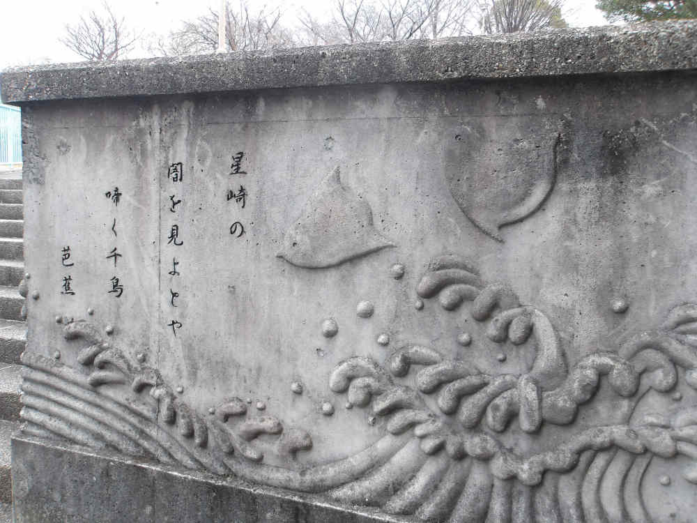 この道を行くと公園の入口にはコンクリートの塀があり、「千句塚公園」と松尾芭蕉の発句、そして波と千鳥が描かれています。