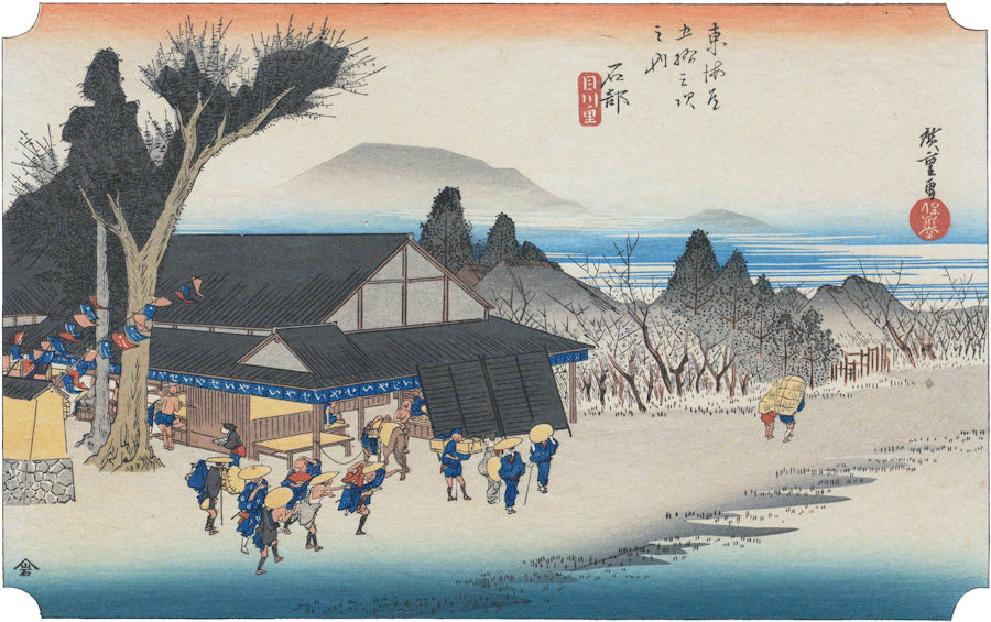 歌川広重は保永堂板「東海道五拾三次」で、「石部 目川ノ里」として石部宿をこのように描いています。
